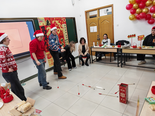 初级二班的联欢现场洋溢浓浓的古典韵味。在叶玉纯老师的指导下,同学们一起体验传统游戏——投壶。大家排队屏气瞄准、扬手投壶,在一招一式中感受古人宴饮雅趣,每一次箭矢入壶,都赢来满堂喝彩。在“全球新年习俗分享”环节,同学们畅谈各自国家的跨年传统,让投壶、祈福等中华民俗与异国文化交融互鉴,让传统民俗在跨文化对话中再次焕发了生机。