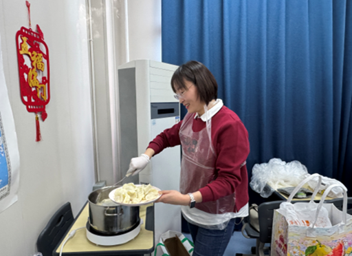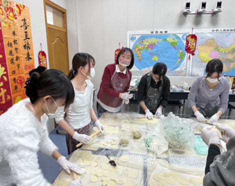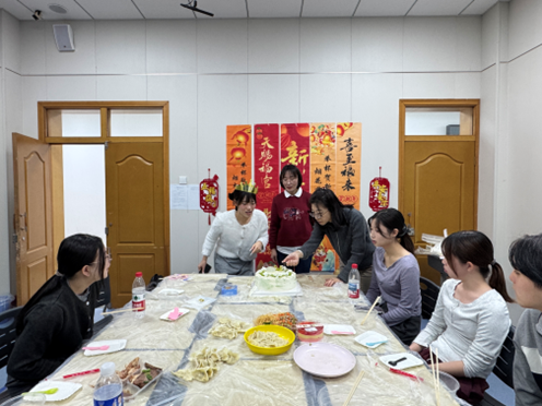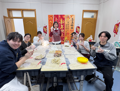 佛教大学项目班的跨年夜满是烟火气与团圆味儿。宗圆老师带领同学们体验包饺子这一传统年俗,擀皮、包馅儿、煮饺子——大家分工协作,忙得不亦乐乎。一个个饺子虽形态各异,但都包裹着“团圆美满”的寓意。令人惊喜的是,当天恰逢两位同学生日,大家借跨年之喜、民俗之暖共庆生辰,让中华民俗中的团圆理念与人文关怀悄然浸润心间。