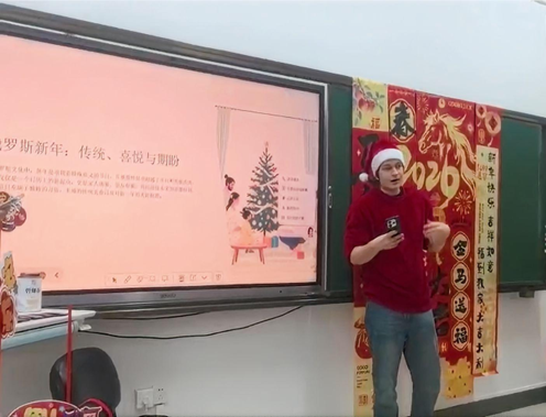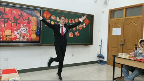 初级一班的跨年联欢兼具观赏性与仪式感。同学们轮番登台亮相,明快热烈的舞姿赢得阵阵喝彩,悠扬的吉他旋律撩人心弦,全员大合唱更是点燃现场氛围,同学们用歌声传达了对中华传统文化的热爱。张青岭老师准备的新年红包,承载着“压岁祈福”的传统寓意,让同学们在收获惊喜的同时,感受到中华民俗中“平安顺遂”的文化内涵,幸福感与文化认同感实现了双向奔赴。